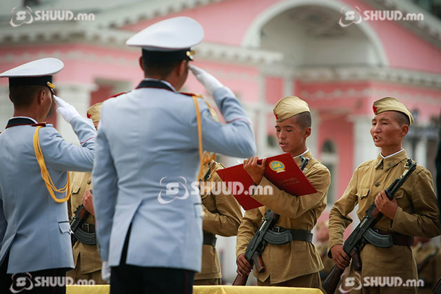 Оюутан-байлдагчид сүр хүч, тэмцэл ялалтын бэлгэдэл аранзал улаан тугандаа сөгдөн ёсолж, эх орондоо үнэнч байхаа батлан тангарлалаа. Цэргийн тангараг өргөнө гэдэг ердийн ёслол биш, эх орноо батлан хамгаалах Үндсэн хуулинд заасан иргэнийхээ журамт үүргийг биелүүлэхээ эх орондоо тангараглаж буй гүн хүндэтгэл юм. Энэ цаг мөчөөс хойш тэд өргөсөн тангарагтаа үнэнч байж эх орон дуудсан цагт хэзээд бэлэн байх үүрэг хүлээж байгаа юм.