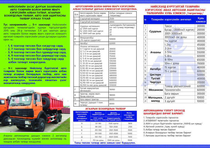 Нийслэлийн Засаг даргын 2016 оны 1 сарын 13-ны өдрийн А/33 дугаар захирамжаар Автотээврийн болон өөрөө явагч хэрэгслийн албан татвар, агаарын бохирдлын төлбөр, автозам ашигласны төлбөр хураах ажлыг 2016 оны 01 дүгээр сарын 15-ны өдрөөс эхлэн нийслэлд зохион байгуулан ажиллаж байна. Нийслэлийн хэмжээнд төвийн 6 дүүрэгт тээврийн хэрэгслийн албан татвар, төлбөр хураах 15 цэг уртасгасан цагаар ажиллаж байна.НИТХ-ын Тэргүүлэгчдийн 2015 оны 28 дугаар тогтоолын дагуу тээврийн хэрэгслийн албан татвар, агаарын бохирдлын болон автозам ашигласны төлбөрийг тээврийн хэрэгслийн улсын дугаарын сүүлийн оронгоор нь ялган хамруулж байгаа бөгөөд энэ сард 4,9 тоогоор төгссөн дугаартай тээврийн хэрэгсэл албан татварт хамрагдана. Гуравдугаар сард 3,8 тоогоор төгссөн дугаартай тээврийн хэрэгслэл албан татварт хамрагдах ёстой бөгөөд татвар төлөгдөөгүй тохиолдолд замын хөдөлгөөнд оролцуулахгүй, захиргааны арга хэмжээ тооцож торгууль ногдуулахыг анхаарна уу гэж Нийслэлийн ЗДТГ-ын Хэвлэл мэдээлэл, олон нийттэй харилцах хэлтсээс мэдээллээ.