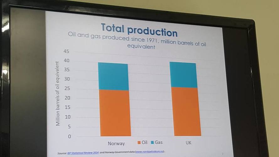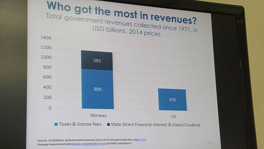 Дэлхийн байгалийн нөөцийн засаглалын институтын судалгаа сонирхол татав. Доорх хоёр графикт Англи, Норвег хоёр улсын 1971-2014 оны хооронд олборлосон газрын тос, байгалийн хийн хэмжээг үзүүлжээ. Олборлолт нь биет хэмжээгээр тэнцүү шахуу болов ч улсдаа авсан татвар, ноогдол ашгийн хэмжээгээрээ Норвег нь Англиас бараг 3 дахин их байна. Хараар бодоход Англи нь илүү баймаар юм шиг. Гэтэл Норвег илүү алсын хараатай, байгалийн нөөцийн засаглал хэрэгжүүлжээ. Норвегийн баялгийн сан нь дэлхийн томоохон сангуудад ордог. Байгалийн баялгаасаа олсон орлогын зохих хувийг хэрэглээндээ тааруулан зарж, бусдыг нь хуримтлуулж гадаадын улс орнуудын ашигтай төслүүдэд хөрөнгө оруулалт хийх замаар сангаа арвижуулсан дэлхийн шилдэг туршлага.