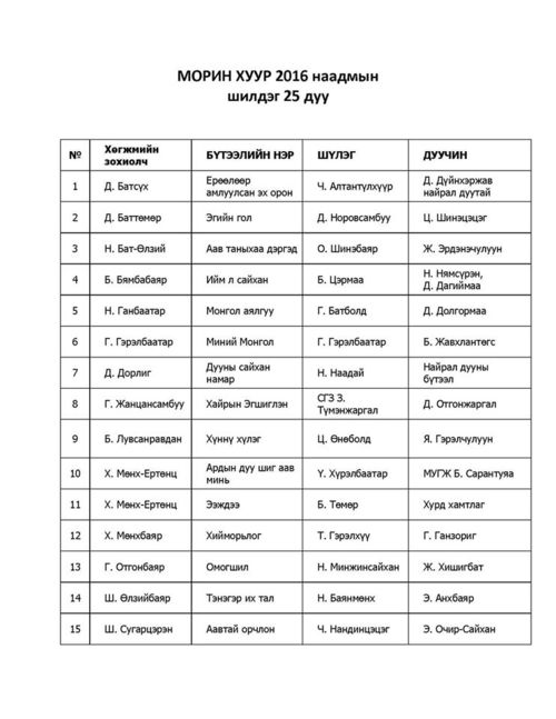 Оны шилдэг дуу шалгаруулж, ая, аялга, хэлбэр, хөгжмийн найруулгыг тодорхойлох “Морин хуур-2016” наадмын эхний шалгаруулалт өчигдөр /2017.02.14/ боллоо. Шалгаруулалтаар наадмын шилдэг 25 дууны нэрсийг тодруулав.