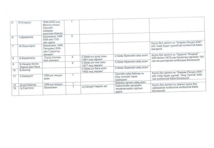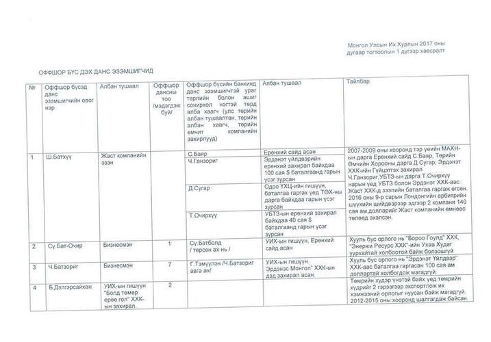 Хоёрдугаарт, Монгол Улсын иргэд, аж ахуйн нэгж оффшор бүсийн банкинд байршуулсан хөрөнгө хууль бус болох нь нотлогдсон тохиолдолд уг этгээдтэй ашиг сонирхол нэгтэй, ураг төрлийн холбоотой иргэнийг төрийн албан наймаас доошгүй жилээр ажиллахыг хориглох, одоо төрд алба хашиж байгаа тохиолдолд төрийн албан тушаалаас нь чөлөөлөх, эгүүлэн татах агуулга бүхий хуулийн төсөл санаачлан УИХ-д өргөн барихыг Засгийн газарт даалгах тухай хүссэн байгаа" гэв.