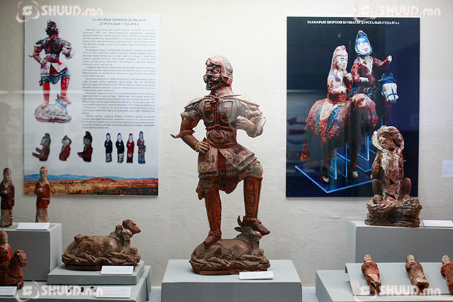 Тухайлбал Нийтийн тооллын 677 оны орчим холбогдох Пүгү аймгийн язгууртны бунхант оршуулгаас илэрсэн ховор олдворууд, Хятаны үед холбогдох шүдний ясан сойз, шаазан хүний баримал, ваар сав, хоол хүнсэндээ хэрэглэж байсан загасны яс, хясаа, тарималжуулан хэрэглэж асан үр тариа, Заамарын бунхант булшнаас илэрсэн шавар, модон хүүхэлдэй, туг, хятад бичээстэй хөшөө зэргийг үзэсгэлэнд байршуулсан байна.