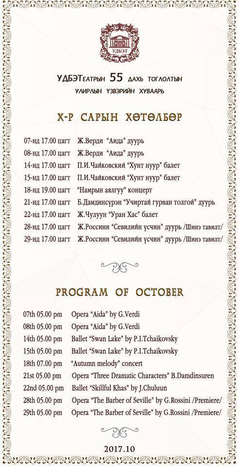 Мөн 55 дахь улирлын тоглолт энэ сарын 18-нд 19.00 цагт “Намрын аялгуу” концертоор үргэлжлэх бөгөөд 21-нд “Учиртай гурван толгой”, 22-нд “Уран хас”, 28, 29-нд “Севилийн үсчин” шинэ дуурийг 17.00 цагт тус тус тоглох юм.