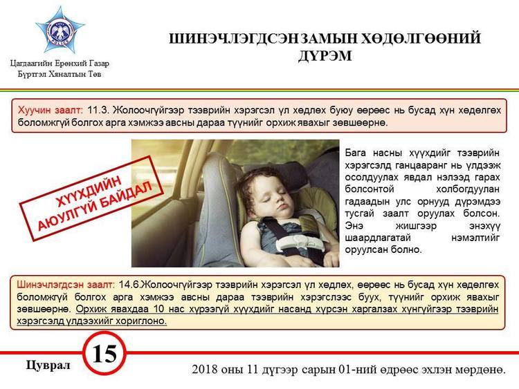 Мөн 10 хүртэлх насны хүүхдийг авч явахдаа зориулалтын нэмэгдэл суудал буюу хамгаалах хэрэгсэл ашиглах, 10 нас хүрээгүй хүүхдийг харгалзах хүнгүйгээр автомашиндаа үлдээхийг хориглох ажээ.