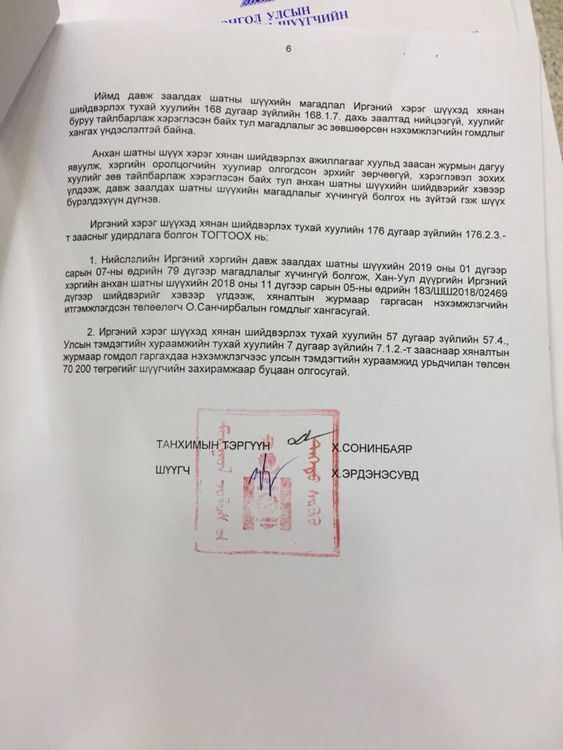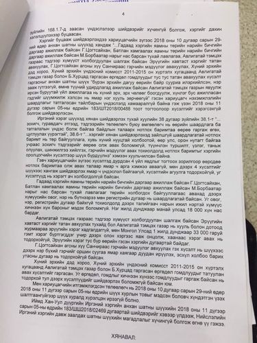Иймд давж заалдах шатны шүүхийн магадлал Иргэний хэрэг шүүхэд хянан шийдвэрлэх тухай хуулийн 168 дугаар зүйлийн 168.1.7 дахь заалтад нийцээгүй, хуулийг буруу тайлбарлаж хэрэглэсэн байх тул магадлалыг эс зөвшөөрсөн нэхэмжлэгчийн гомдлыг хангах үндэслэлтэй байна... Нийслэлийн Иргэний хэргийн давж заалдах шатны шүүхийн 2019 оны нэгдүгээр сарын 07-ны өдрийн 79 дүгээр магадлалыг хүчингүй болгож, Хан-Уул дүүргийн Иргэний хэргийн анхан шатны шүүхийн 2018 оны арваннэгдүгээр сарын 05-ны өдрийн 183/ШШ2018/02469 дүгээр шийдвэрийг хэвээр үлдээж хяналтын журмаар гаргасан нэхэмжлэгчийн итгэмжлэгдсэн төлөөлөгч О.Санчирбалын гомдлыг хангасугай” гэж шийдвэрлэжээ.