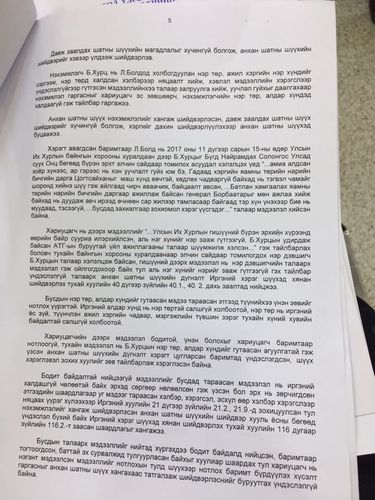 Харин хариуцагч шүүхэд гаргасан хариу тайлбартаа “УИХ-ын гишүүн Л.Болдын 2017 оны арваннэгдүгээр сарын 15-ны өдрийн УИХ-ын Аюулгүй байдал, гадаад бодлогын байнгын хороон дээр хэлсэн ярьсан зүйл нь УИХ-ын гишүүний бүрэн эрхийн дагуу өөрийн байр сууриа илэрхийлсэн, аль нэг хүний нэр зааж гүтгээгүй, түүний өмнө нь удирдлагад нь ажиллаж байсан АТГ-ын явуулж ирсэн буруутай үйл ажиллагаа нь хүний эрх чөлөөг боогдуулж, хүнлэг бус ажилласан гэдгийг шүүмжилж хэлсэн нь ямар нэгэн хуулийн зүйл заалтыг зөрчсөн үйлдэл биш юм. Хурал дээр тухайлан Б.Хурцыг буруутгаж, нэрийг нь дурдсан нэг ч үг хэлээгүйг анхаарна уу” гэж дурдсан байна. Энэхүү шүүх хуралдаанаас “Хариуцагчийн дээрх мэдээлэл бодитой, үнэн болохыг хариуцагч баримтаар нотлоогүй, тухайн мэдээлэл нь Б.Хурцын нэр төр, алдар хүндийг гутаасан агуулгатай” гэж үзсэн анхан шатны шүүхийн дүгнэлт хэрэгт цугларсан баримтад үндэслэгдсэн, шүүх хэрэглэвэл зохих хуулийг зөв тайлбарлаж хэрэглэсэн байна...