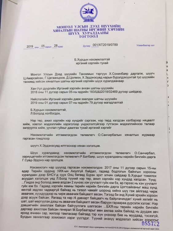 Улсын Дээд шүүхийн Хяналтын шатны Иргэний хэргийн шүүх хуралдаан 2019 оны тавдугаар сарын 28-нд болж, ТЕГ-ын дарга асан Б.Хурцын нэхэмжлэлтэй, УИХ-ын гишүүн Л.Болдод холбогдох хэргийг хэлэлцэж шийдвэрээ гаргажээ.