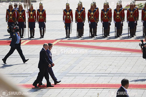 Монгол Улсын Ерөнхийлөгч Х.Баттулга, ОХУ-ын Ерөнхийлөгч В.В.Путиныг 13:00 цагт Сүхбаатарын талбайд албан ёсоор угтах ёслол боллоо. ОХУ-ын Ерөнхийлөгч В.В.Путиныг угтан авахад хүндэт харуул жагсаж, хоёр улсын Төрийн дуулал эгшиглүүлэв. ОХУ-ын В.В.Путин их эзэн Чингис хааны хөшөөнд хүндэтгэл үзүүллээ.