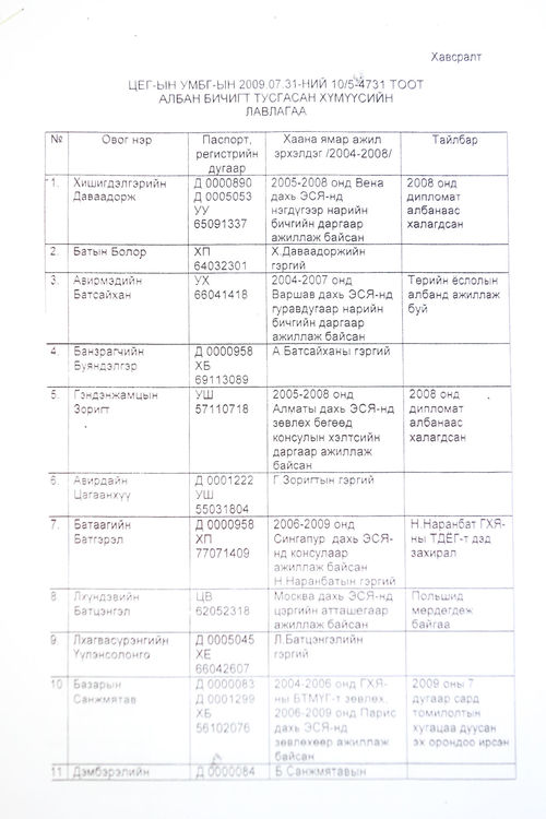 3. Д.Мөнх-Эрдэнэ БНХАУ-ын Хөх хот дахь Ерөнхий консулын албан тушаалаас чөлөөлөгдсөн байна. Албан үүргээ гүйцэтгэж байгаа эрхээ хэтрүүлэн ашиглаж, тээврийн хэрэгслийг Хятад улсад татваргүйгээр нэвтрүүлж, ашиглуулсан зөрчил гаргажээ.