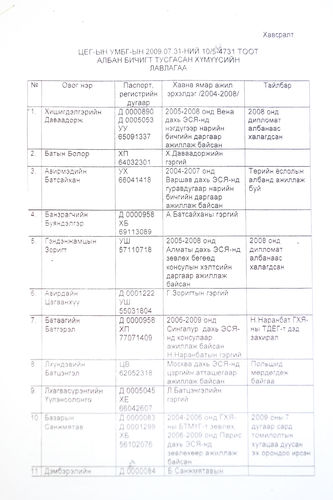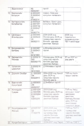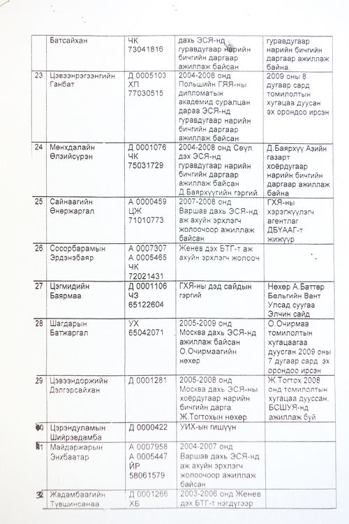 - Хилийн чанадад дипломат төлөөлөгчийн газарт ажиллаж байхдаа хууль бус наймаанд оролцсон талаарх мэдээллийг өгч байсан. Тэр үед хаалттай мэдээлэл байсан. Хилийн чанадад ял эдэлж байгаа Монгол Улсын иргэдийн мэдээлэлтэй хамтатгаж ирүүлсэн байсан. Энэ нь нууцын зэрэглэлд хамаарна. Тиймээс одоо нууцын зэрэглэлгүй мэдээллийг хүлээж авсан. Нийтдээ 69 иргэдийн мэдээлэл байна. Эдгээрээс зарим нь төрийн алба, дипломат албанд, улс төрийн намуудын удирдах түвшний, зарим нь дипломат паспорт ашиглаж хууль бус хэрэгт холбогдсон хүмүүс байгаа. Манай байнгын хорооноос хар тамхи, мансууруулах бодист оролцож байгаа дипломат албан хаагчдад хариуцлага тооцох, албанаас нь чөлөөлөх, хуулийн хариуцлага тооцох арга хэмжээ авч байгаа. Монгол Улс дотооддоо хар тамхины хэрэглээг таслан зогсоох, сүлжээ нь олох, хуулийн хариуцлага тооцох чиглэлд байнгын хорооноос чиглэл өгч, хамтарч ажиллаж байгаа.