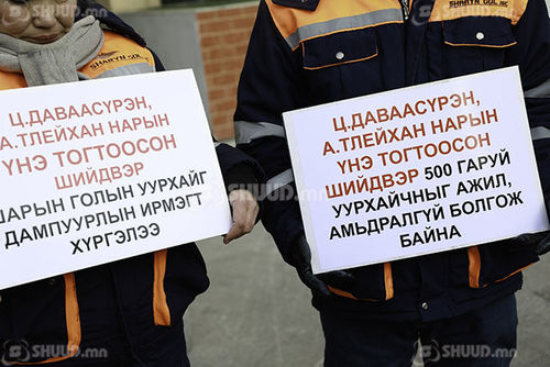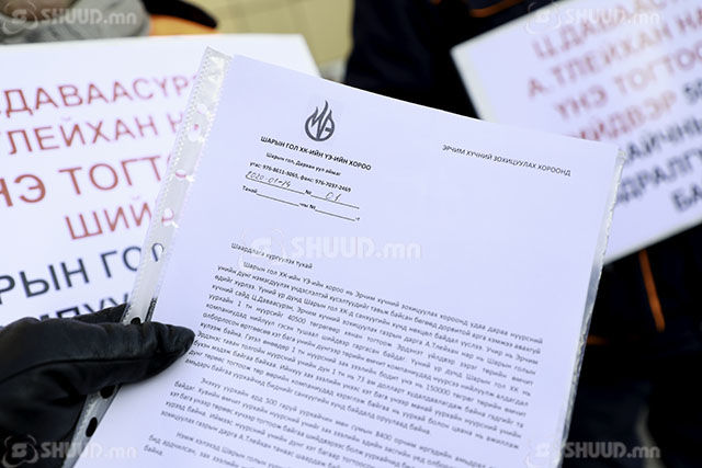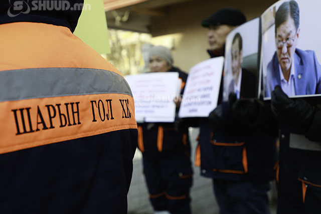 Эрчим хүчний зохицуулах хорооны гадна Шарын голын уурхайчдын төлөөлөл жагслаа. Уурхайчид ЭХ-ний сайд Ц.Даваасүрэн Шарын голын уурхайг дампуурлын ирмэгт хүргэж байгааг эсэргүүцэн мэдэгдэл хийв. “Шарын гол” үйлдвэрчний хорооны дарга Л.Наранбаатар:
