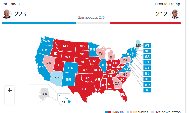 АНУ-д шөнө дунд болж, санал тоолох ажиллагаа үргэлжилсээр байна. Вашингтоны цагаар 11 дүгээр сарын дөрөвний 01:10, Улаанбаатарын цагаар 11 дүгээр сарын дөрөвний 14:10 цагийн байдлаар Ардчилсан намаас нэр дэвшигч Жо Байден электоратын 223 саналтайгаар илүүрхэж байна. Өмнө нь Трампын санал хол зөрүүтэй байсан бол Флорида мужийн саналыг тоолсны дараа санал хоорондын зөрүү ойртож Трампын электоратын санал 212 болжээ.
