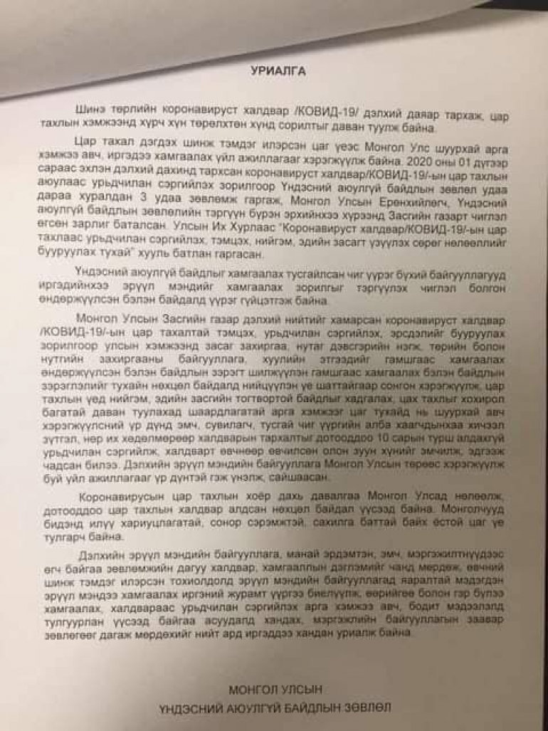Цар тахал дэгдэх шинж тэмдэг илэрсэн цаг үеэс Монгол Улс шуурхай арга хэмжээ авч, иргэдээ хамгаалах үйл ажиллагааг хэрэгжүүлж байна. 2020 оны 01 дүгээр сараас эхлэн дэлхий дахинд тархсан коронавируст халдвар /Ковид-19/-ын цар тахлын аюулаас урьдчилан сэргийлэх зорилгоор Үндэсний аюулгүй байдлын зөвлөл удаа дараа хуралдан 3 удаа зөвлөмж гаргаж, Монгол Улсын Ерөнхийлөгч, Үндэсний аюулгүй байдлын зөвлөлийн тэргүүн бүрэн эрхийнхээ хүрээнд Засгийн газарт чиглэл өгсөн зарлиг баталсан. Улсын их хурлаас коронавируст халдвар /Ковид-19/-ын цар тахлаас урьдчилан сэргийлэх, тэмцэх, нийгэм, эдийн засагт үзүүлэх сөрөг нөлөөллийг бууруулах тухай хууль батлан гаргасан.