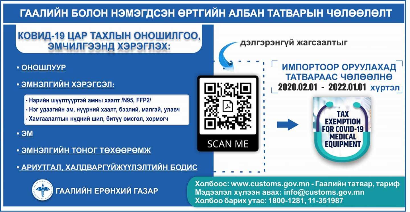 Гаалийн ерөнхий газраас "Ковид 19" цар тахлын оношилгоо, эмчилгээнд хэрэглэх, татвараас чөлөөлөгдсөн барааны жагсаалтыг гаргажээ.