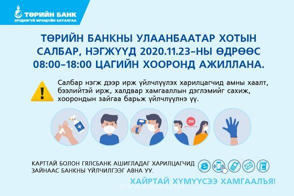 Харин иргэдийн хүсэлтээр цахимаар үйл ажиллагаа явуулж байсан арилжааны банкууд өнөөдрөөс тодорхой хугацаагаар салбаруудаа, нээн ажиллаж байна. Тухайлбал, Төрийн банкны салбарууд 08:00-18:00 цагийн хороонд ажиллахаар хуваарилжээ.