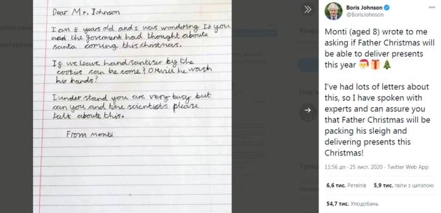 Их Британийн Ерөнхий сайд Борис Жонсонд Монти хэмээх найман настай хүү захидал илгээжээ. Хүү хөл хорионы үед Санта Клаус бэлгээ хүргэж ирэх эсэхэд санаа зовнин ийнхүү Ерөнхий сайдад хандан захидал бичсэн байна. Энэ захидлыг Жонсон Твиттер хуудсандаа нийтэлсний дээр хүүд ч хариу захидал илгээжээ.