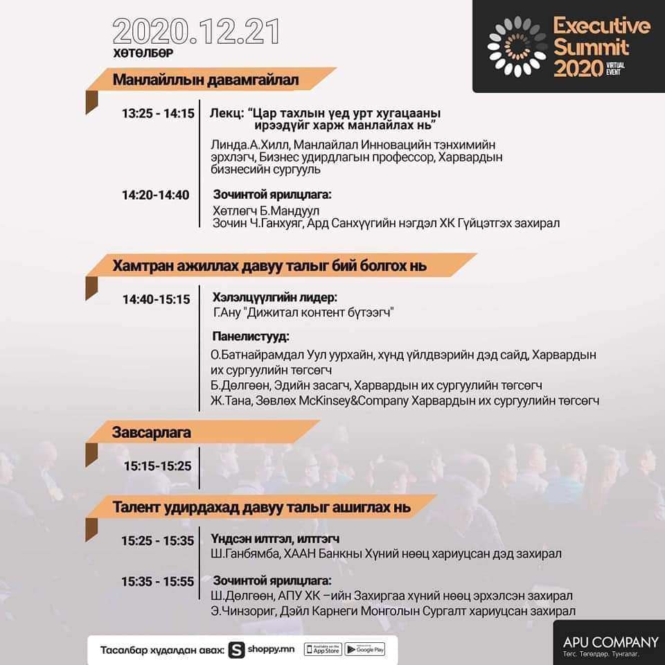Байгууллагын гүйцэтгэх удирдлага, дунд шатны менежерүүд, гарааны бизнес эрхлэгчдэд зориулсан “1000 CEO, 1000 хүчирхэг компани” бизнесийг дэмжих төслийн хүрээнд “Executive summit 2020” виртаул сургалт-хэлэлцүүлэг өнөөдөр эхэлнэ.