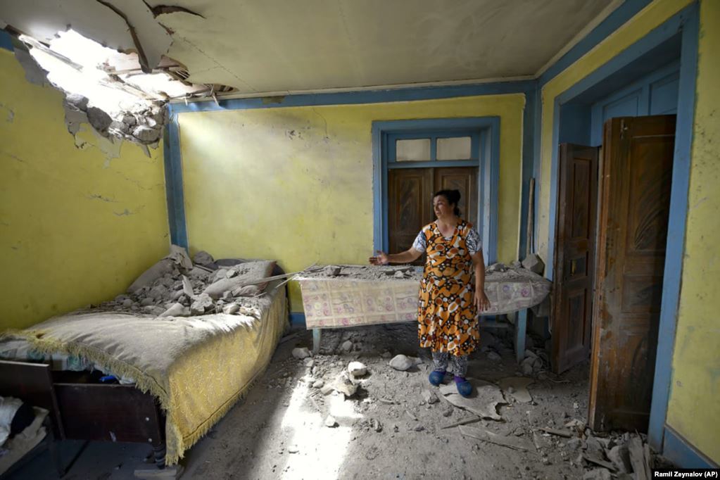 Азербайжаны Товукийн дүүрэг рүү Арменийн цэргүүд гал нээсний дараа байшин нь хэрхэн эвдэрсэн талаар харуулж буй эмэгтэй. 2020.07.14