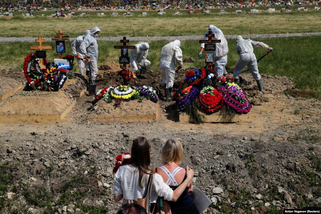 Оросын Санкт-Петербургийн захад оршуулгын газрын тусгай хэсэгт коронавирусийн халдварын улмаас нас барсан хүнийг оршуулж байгаа нь. 2020.06.26.
