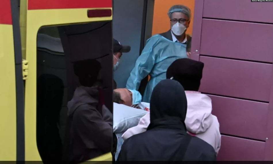 Омск хотын эмч нар Оросын сөрөг хүчний улс төрч Алексей Навальныйг Герман руу шилжүүлэхээр нисэх буудал руу хүргэхээр түргэн тусламжийн машинд оруулж байна. 2020.08.22.