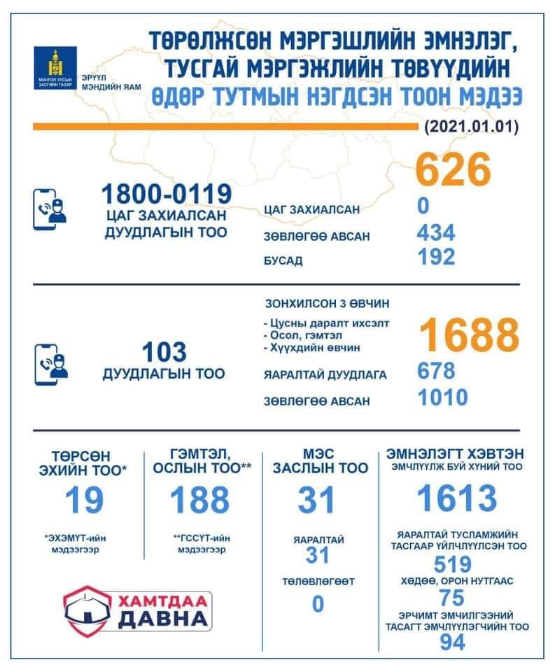 Яаралтай түргэн тусламжийн 103 дугаарт 1688 дуудлага ирснээс 678 нь яаралтай тусламж, 1019 нь зөвлөгөө мэдээлэл авчээ. Харин 1800-0119 зөвлөгөө мэдээллийн дугаараас 626 хүн мэдээлэл авчээ.