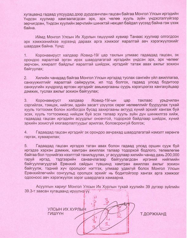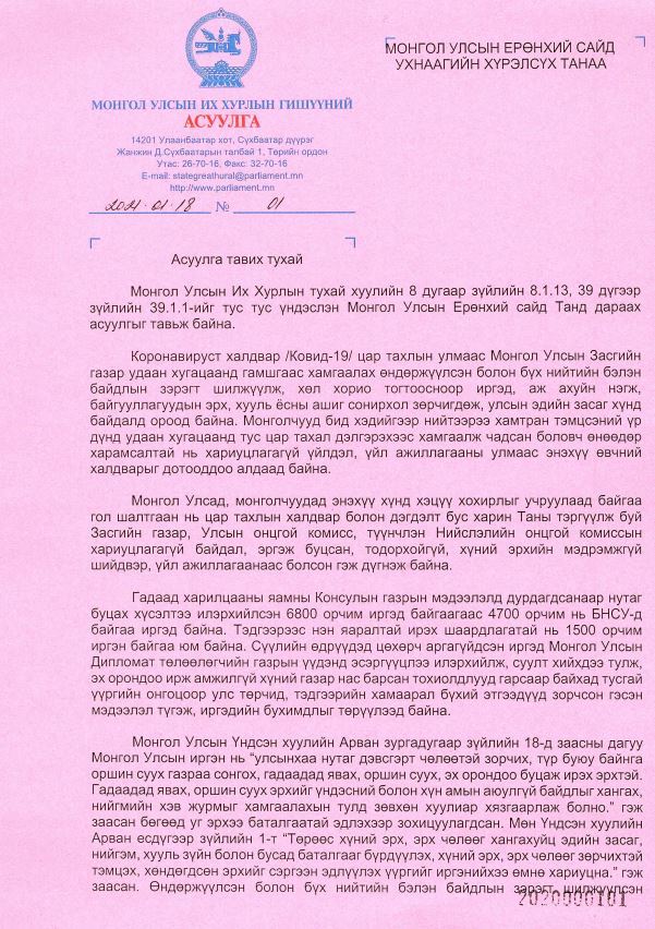 УИХ-ын гишүүн Т.Доржханд Ерөнхий сайдад асуулга тавилаа. Тэрбээр асуулгадаа гадаадад байгаа иргэдийн эрх ашгийг хамгаалах, Коронавируст халдвар /Ковид-19/ цар тахлын улмаас гадаадад гацсан иргэдийг эх орондоо ирэх нөхцөлөөр хангах, бодит дэмжлэг үзүүлэх, гадаадад гацсан иргэдээ татан авах нэмэх хуваарь гаргах асуудлаар хандсан байна.