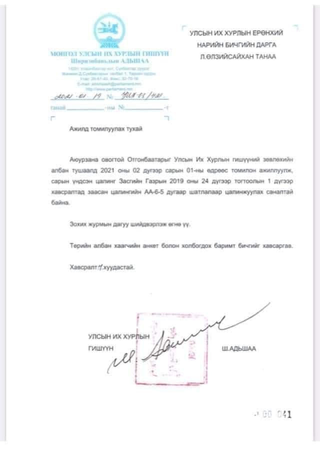 А.Отгонбаатар УИХ-ын гишүүний зөвлөхийн ажлаасаа татгалзжээ