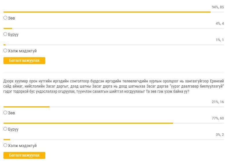 Дээрх хуулиар орон нутгийн иргэдийн сонголтоор бүрдсэн иргэдийн төлөөлөгчдийн хурлын оролцоог нь хангахгүйгээр Ерөнхий сайд аймаг, нийслэлийн Засаг даргыг, дээд шатны Засаг дарга нь доод шатныхаа Засаг даргаа “үүрэг даалгавар биелүүлээгүй” гэдэг тодорхой бус үндэслэлээр огцруулах, түүнчлэн сахилгын шийтгэл ногдуулахыг Та зөв гэж үзэж байна уу?