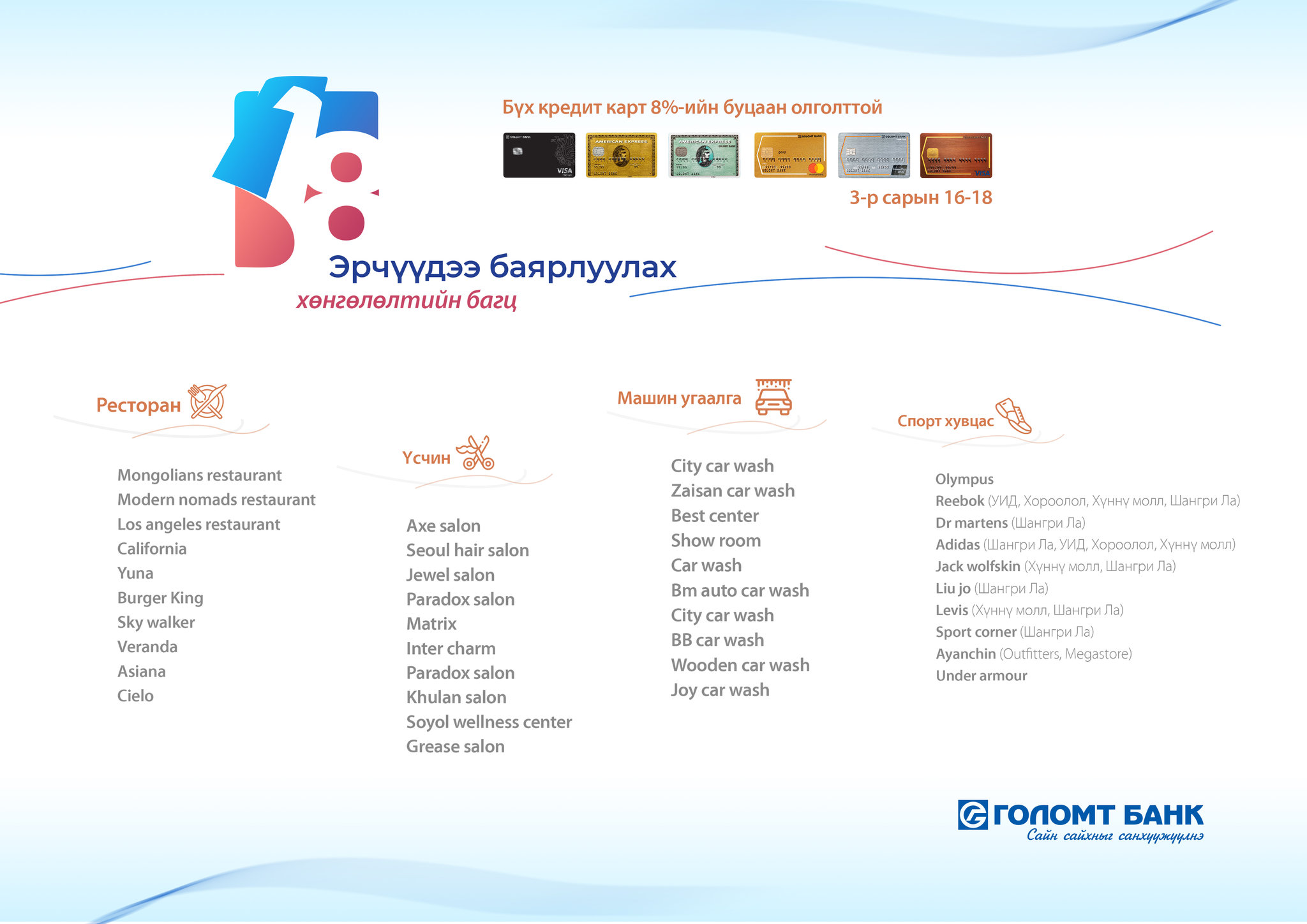 Харилцагч та 2021.03.16-18-ны өдрийг дуустал хамтрагч үйлчилгээний байгууллагуудын Голомт банкны карт уншигч төхөөрөмж дээр Голомт банкны кредит картаар худалдан авалт хийгээд энэхүү урамшуулалд оролцоорой. Таны худалдан авсан бүтээгдэхүүн үйлчилгээний үнийн дүнгийн 8%-ийн буцаалт 2021.03.26-ний дотор төлбөр хийсэн кредит карт руу тань орно.
