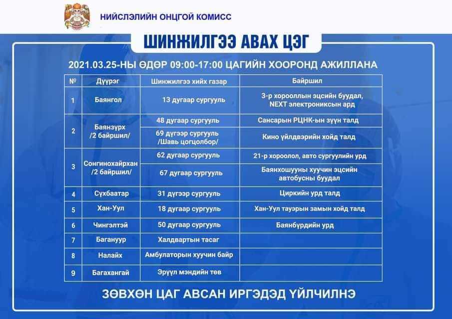 Нийслэлийн хэмжээнд өнөөдөр дараах цэгүүдэд коронавирусийн халдвар илрүүлэх шинжилгээг авна.