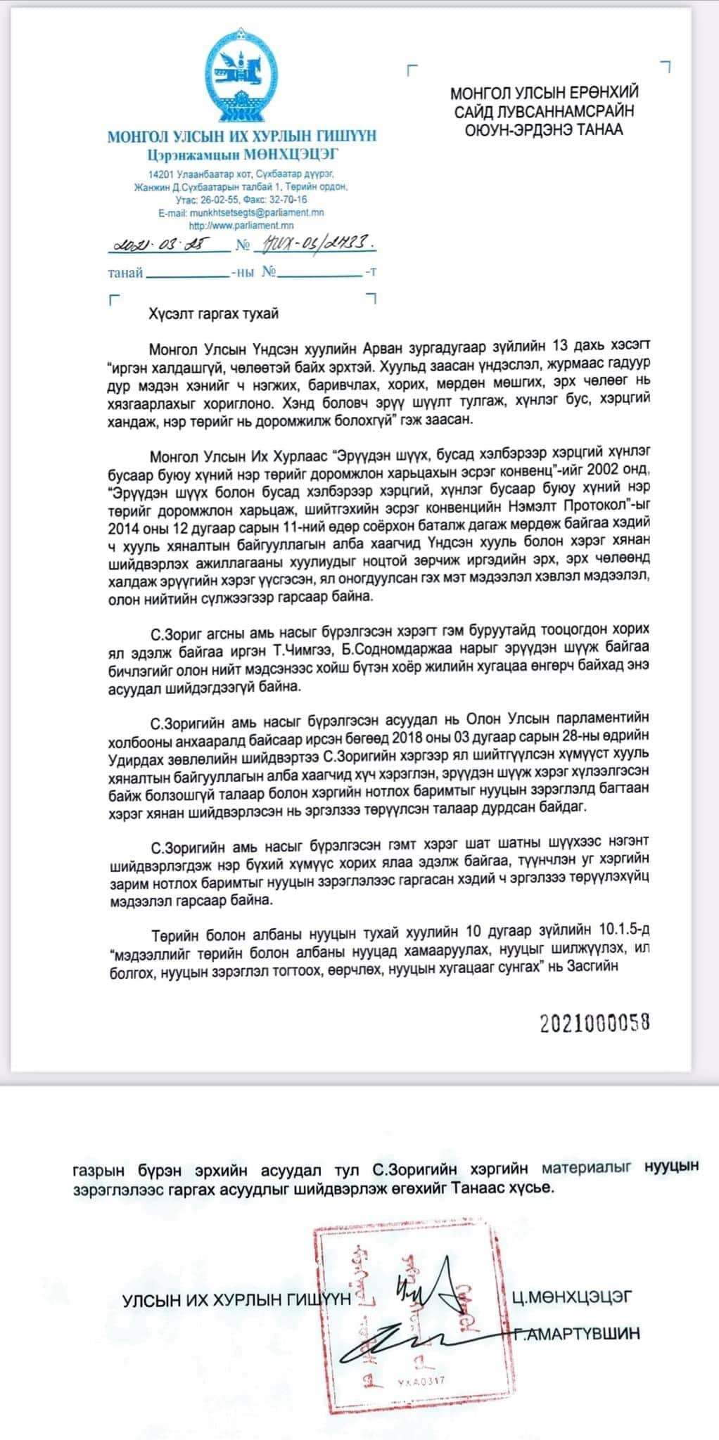 Төрийн болон албаны нууцын тухай хуулийн 10 дугаар зүйлийн 10.1.5-д “мэдээллийг төрийн болон албаны нууцад хамааруулах, нууцыг шилжүүлэх, ил болгох, нууцын зэрэглэл тогтоох, өөрчлөх, нууцын хугацааг сунгах” нь Засгийн газрын бүрэн эрхийн асуудал тул С.Зоригийн хэргийн материалыг нууцын зэрэглэлээс гаргах асуудлыг шийдвэрлэж өгөхийг Танаас хүсье” гэжээ.