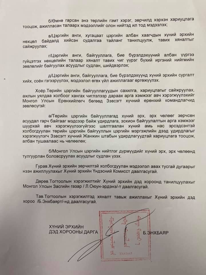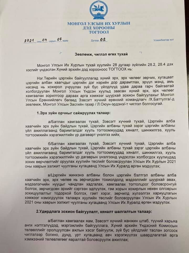 УИХ-ын Хүний эрхийн дэд хороо өчигдөр хуралдаж, төрийн цэргийн байгууллагад хүний эрх, эрх чөлөөг зөрчих, “цэргийн дэг” нэрийн дор хугацаат цэргийн алба хаагчдыг дарамтлах, эрүүл мэнд, амь насанд нь хохирол учруулах зүй бус үйлдлүүд удаа дараа гарч байгаа асуудлыг хэлэлцсэн. Хуралдаанаас “Зөвлөмж, чиглэл өгөх тухай” Дэд хорооны тогтоол гаргасан юм. Төрийн цэргийн байгууллагад хүний эрх, эрх чөлөөг зөрчих, хугацаат цэргийн алба хаагчдыг “цэргийн дэг” нэрийн дор дарамтлах, эрүүл мэнд, амь насанд нь хохирол учруулах зүй бус үйлдлүүд удаа дараа гарч байгаатай холбогдуулан Монгол Улсын Үндсэн хуульд заасан хүний эрх, эрх чөлөөг хамгаалах зорилгоор цэргийн албаны үйл ажиллагаанд баримталдаг хууль тогтоомжуудад хяналт шинжилгээ, хэрэгжилтийн үр дагаварт үнэлгээ хийх, эдгээрт үндэслэн эрх зүйн орчныг сайжруулах зорилгоор холбогдох төслүүдийг 2021 оны хаврын ээлжит чуулганы хугацаанд Улсын Их Хуралд өргөн мэдүүлэх, цэргийн жинхэнэ албан хаагч болон цэргийн бэлтгэл алба хаагчийн эрх, эрх чөлөө нь зөрчигдсөн тохиолдолд мэдээллийг шуурхай авах, мэдээлэгчийн нууцыг чандлан хамгаалах, хадгалах, хамгаалах тогтолцоог боловсронгуй болгох, зөрчигдсөн эрхийг сэргээн хэрэгжүүлэх, гэм хорын хохирлын нөхөн олговрын зохицуулалтыг тодорхой болгож, гэмт хэрэг, зөрчилд хүлээлгэх хариуцлагыг чангатгахыг Монгол Улсын Ерөнхийлөгч, Зэвсэгт хүчний Ерөнхий командлагч Х.Баттулга болон Монгол Улсын Засгийн газар /Л.Оюун-Эрдэнэ/-т чиглэл болгосон байна. Мөн ЗХЖШ-ын удирдлагуудад хариуцлага тооцож, албан тушаалаас нь чөлөөлөхийг Ерөнхийлөгчид зөвлөсөн байна.
