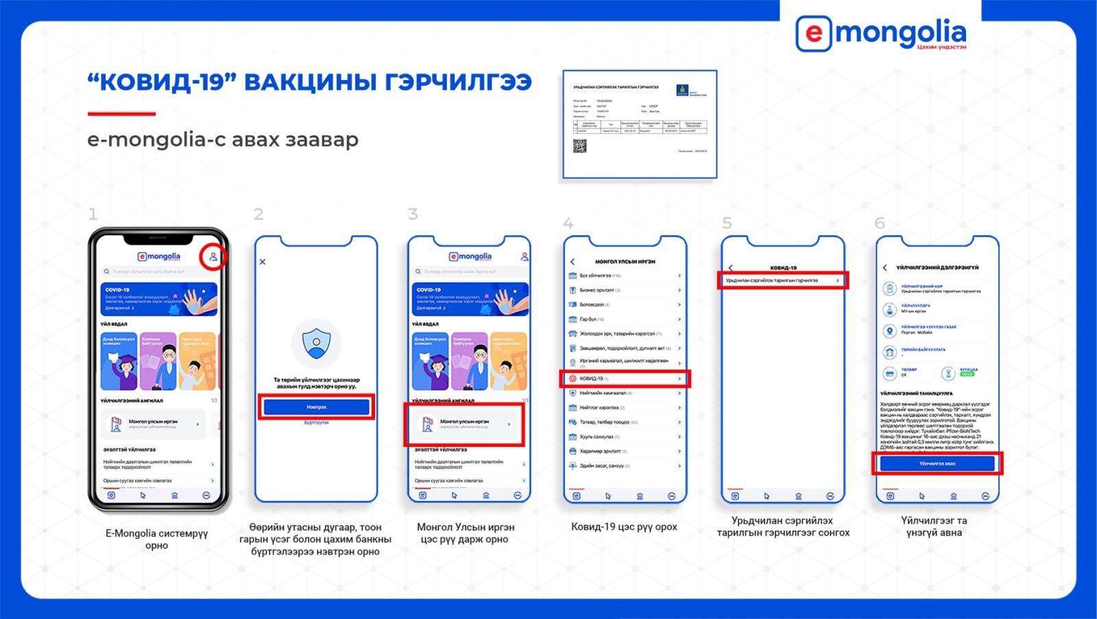 Иргэд болон аж ахуйн нэгж, байгууллагууд үйлчлүүлэгч, хэрэглэгчийнхээ вакцин хийлгэсэн эсэх тухай мэдээллийг E-Mongolia цахим хуудаснаас авч болно. Иргэд өөрийн хийлгэсэн вакцины нэр, үйлдвэрлэсэн улс, дархлаажуулалтад хаана, хэзээ хамрагдсан мэдээллээ авах боломжтой. Аж ахуйн нэгж, байгууллагууд тухайн үйлчлүүлэгч, хэрэглэгч хэдэн тун вакцин тариулсан, баталгаажсан эсэхийг шалгаж болно. Вакцины гэрчилгээг лавлагаа хэлбэрээр монгол, англи хэлээр авах боломжийг ч бүрдүүлээд байна. Монгол Улсын Засгийн газар, Улсын онцгой комисс 2021 оны 05 дугаар сарын 01-ний дотор нийслэлийн насанд хүрсэн бүх хүнийг дархлаажуулалтад хамруулахыг зорьж байна.