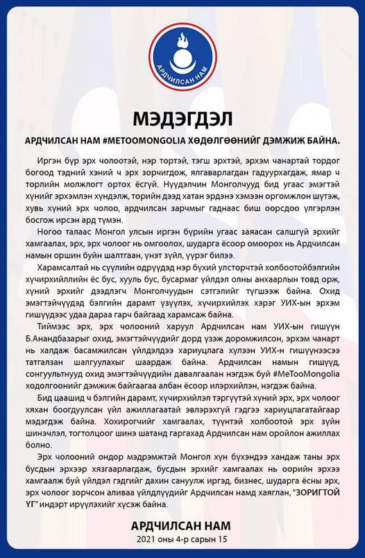 Энэ хөдөлгөөнийг АН дэмжиж байгаагаа илэрхийлж, мэдэгдэл гаргажээ. Уг мэдэгдэлд "АН-аас УИХ-ын гишүүн Ц.Анандбазарыг охид, эмэгтэйчүүдийг дорд үзэж доромжилсон, эрхэм чанарт нь халдаж басамжилсан үйлдэлдээ хариуцлага хүлээж, УИХ-ын гишүүнээсээ татгалзан, шалгуулахын шаардаж байна" гэжээ.
