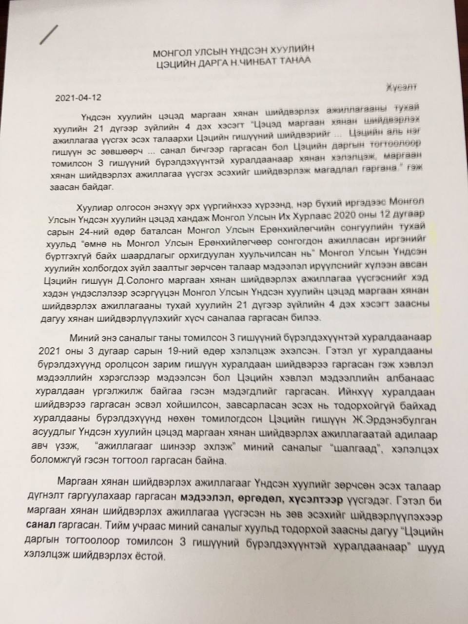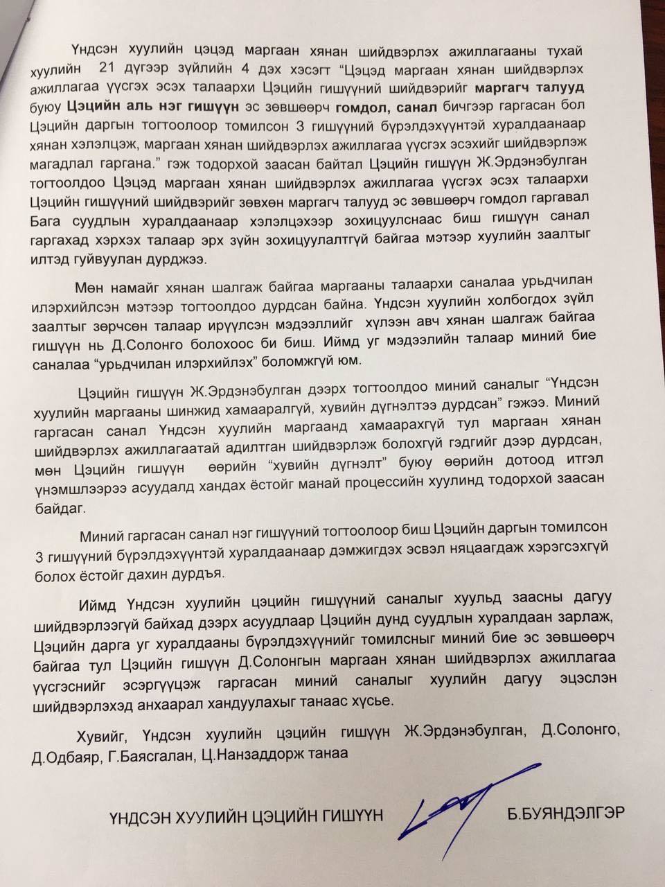 Үндсэн хуулийн цэцийн гишүүн Б.Буяндэлгэр болон Ц.Нанзаддорж нар Цэцийн дарга Н.Чинбатад санал хүргүүлжээ.
