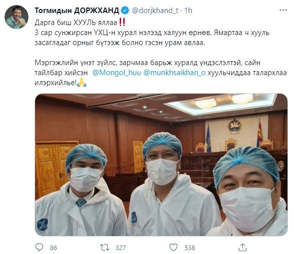Ингэснээр Ерөнхийлөгч Х.Баттулга Ерөнхийлөгчийн сонгуульд дахин нэр дэвших эрхгүй болсон талаар УИХ-ын гишүүн Т.Доржханд цахим хуудасдаа нийтэлсэн байна. Тэрбээр "Дарга биш ХУУЛЬ яллаа. 3 сар сунжирсан ҮХЦ-н хурал нэлээд халуун өрнөв. Ямартаа ч хууль засагладаг орныг бүтээж болно гэсэн урам авлаа. Мэргэжлийн үнэт зүйлс, зарчмаа барьж хуралд үндэслэлтэй, сайн тайлбар хийсэн @Mongol_huu, @munkhsaikhan_o хуульчиддаа талархлаа илэрхийлье!" гэжээ.