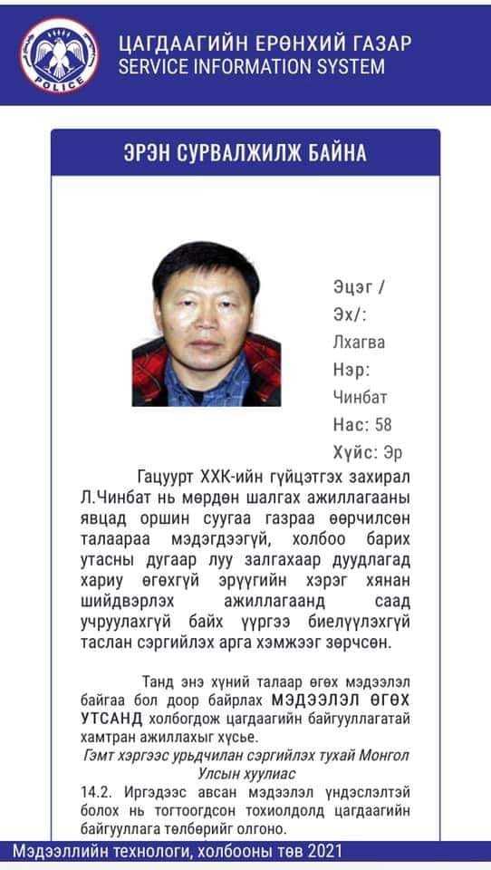 Цагдаагийн байгууллагаас "Гацуурт" ХХК-ийн гүйцэтгэх захирал Л.Чинбатыг эрэн сурвалжилж байна. Түүнийг мөрдөн шалгах ажиллагаанд саад учруулсан хэмээн эрэн сурвалжилж буй аж. Л.Чинбат нь оршин суух газраа өөрчлөхдөө цагдаагийн байгууллагад мэдэгдээгүй, мөн утасны дуудлагад хариу өгөхгүй байгааг цагдаагийн мэдээлэлд дурджээ.