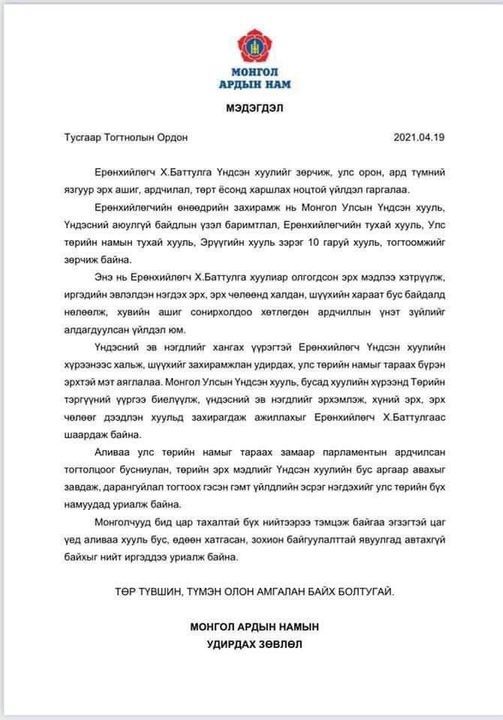 Монгол Улсын Ерөнхийлөгч Халтмаагийн Баттулга Монгол ардын намыг тараах тухай захирамж гаргасантай холбогдуулан тус намын Удирдах зөвлөлөөс дараах мэдэгдлийг хийлээ. Мэдэгдэлд Ерөнхийлөгч Х.Баттулга Үндсэн хуулийг зөрчиж, улс орон, ард түмний язгуур эрх ашиг, ардчилал, төрт ёсонд харшлах ноцтой үйлдэл гаргалаа. Ерөнхийлөгчийн өнөөдрийн захирамж нь Үндсэн хууль, Үндэсний аюулгүй байдлын үзэл баримтлал, Ерөнхийлөгчийн тухай, Улс төрийн намын тухай, Эрүүгийн хууль зэрэг арав гаруй хууль, тогтоомжийг зөрчиж байна гэж үзэж байгаагаа илэрхийллээ.