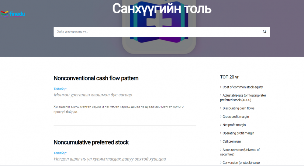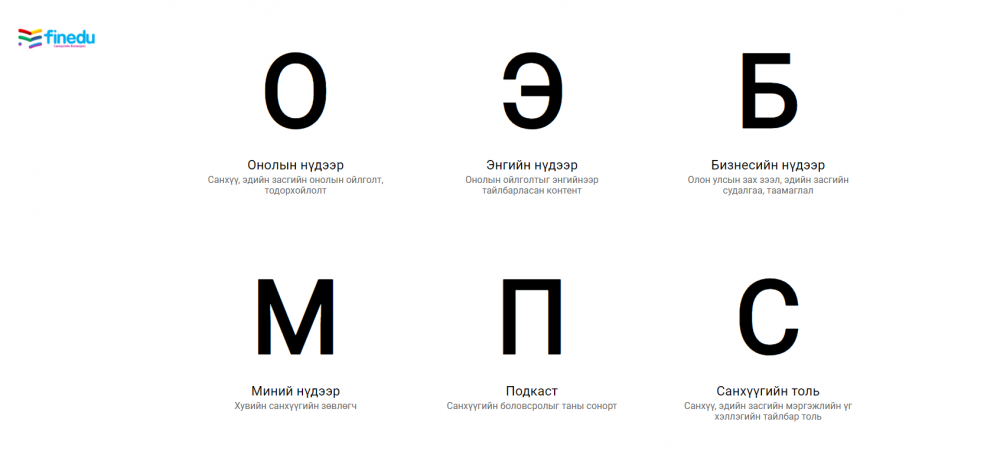 Найман настнаас эхлээд наян настан ч уншаад ойлгохоор тайлбарлаж бичсэн болохоор санхүүгийн тухай мэдээллийг сонирхолтой байдлаар авах юм байна. Ямартай ч finedu.mn сайтын үндсэн булангуудыг сонирхож, эдийн засаг, санхүүгийн талаар ямар мэдээлэл, мэдлэг авах боломжтойг судалснаа хүргэж байна.
