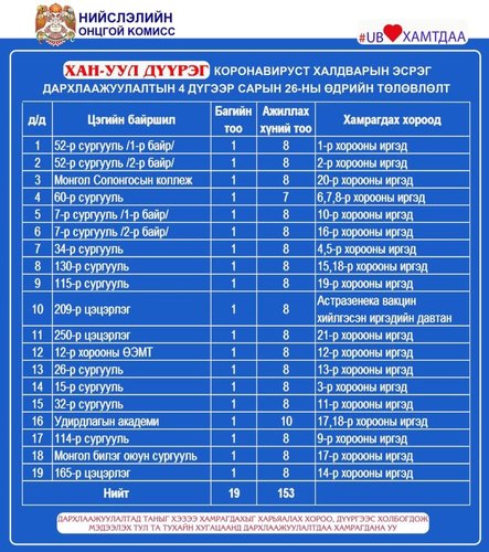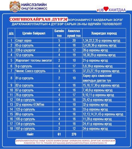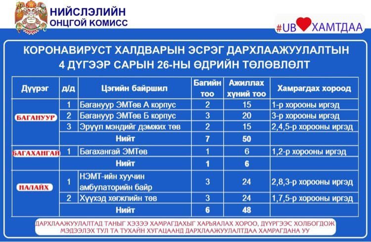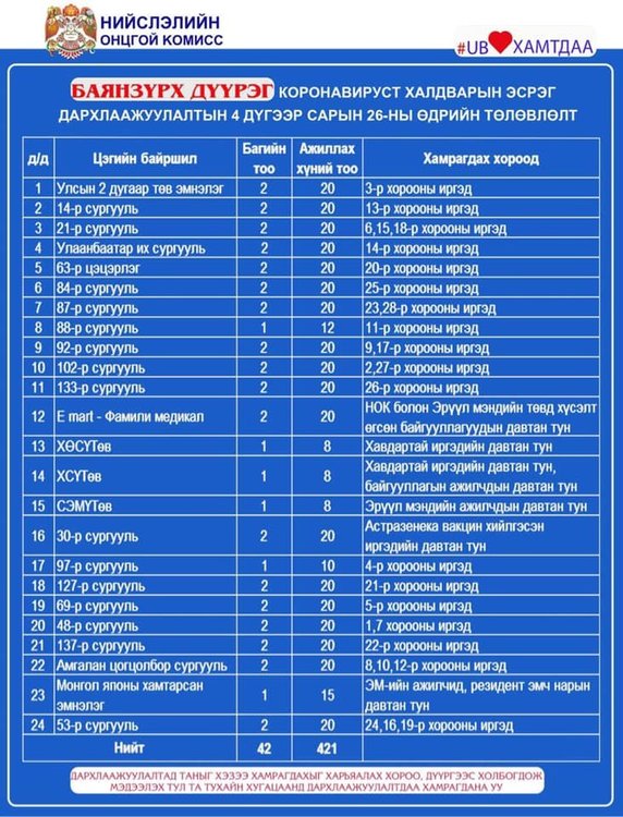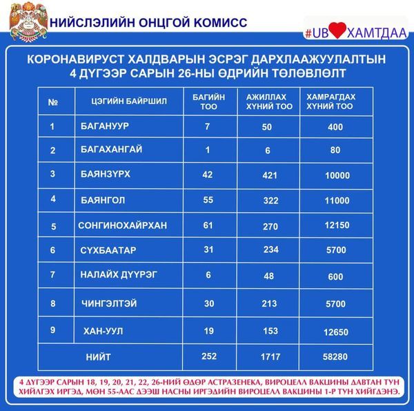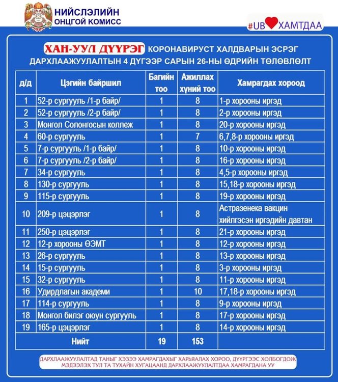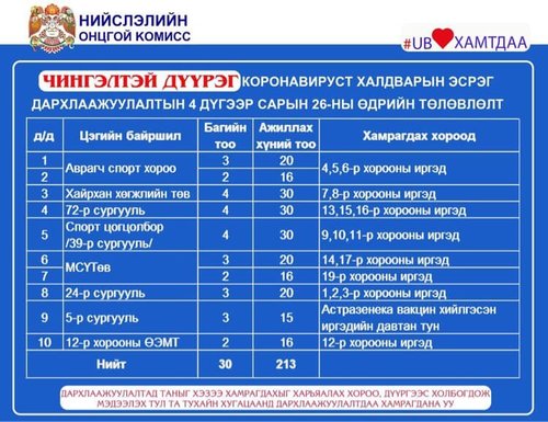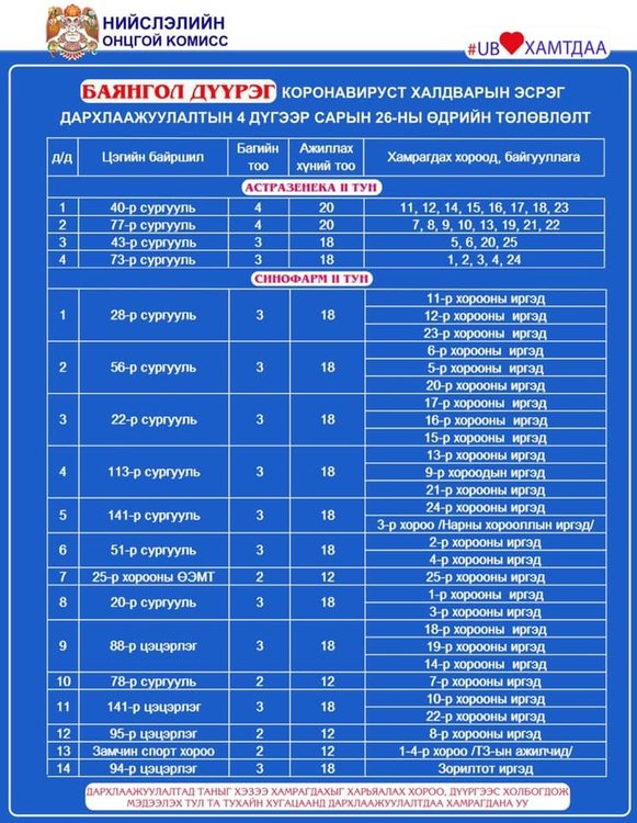 Нийслэлд вакцинжуулалт эрчимтэй явагдаж байгаа. Нийт 120 цэгт болон вакцинжуулалтын явуулын цэг ажиллуулж байгаа билээ. Өнөөдөр ажиллах дархлаажуулалтын цэгийг дүүрэг бүрээр танилцуулж байна.