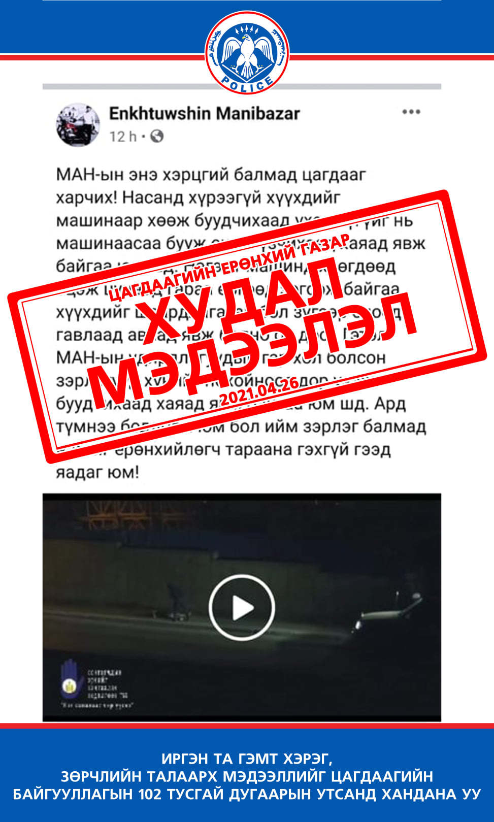 Иймд иргэд Та бүхэн цахим орчинд худал ташаа мэдээлэлд авталгүй, үнэн бодит мэдээллийг ЦЕГ-ын Хэвлэл мэдээллийн төвийн албан ёсны цахим хуудсаас авч байхыг хүсье" гэв.