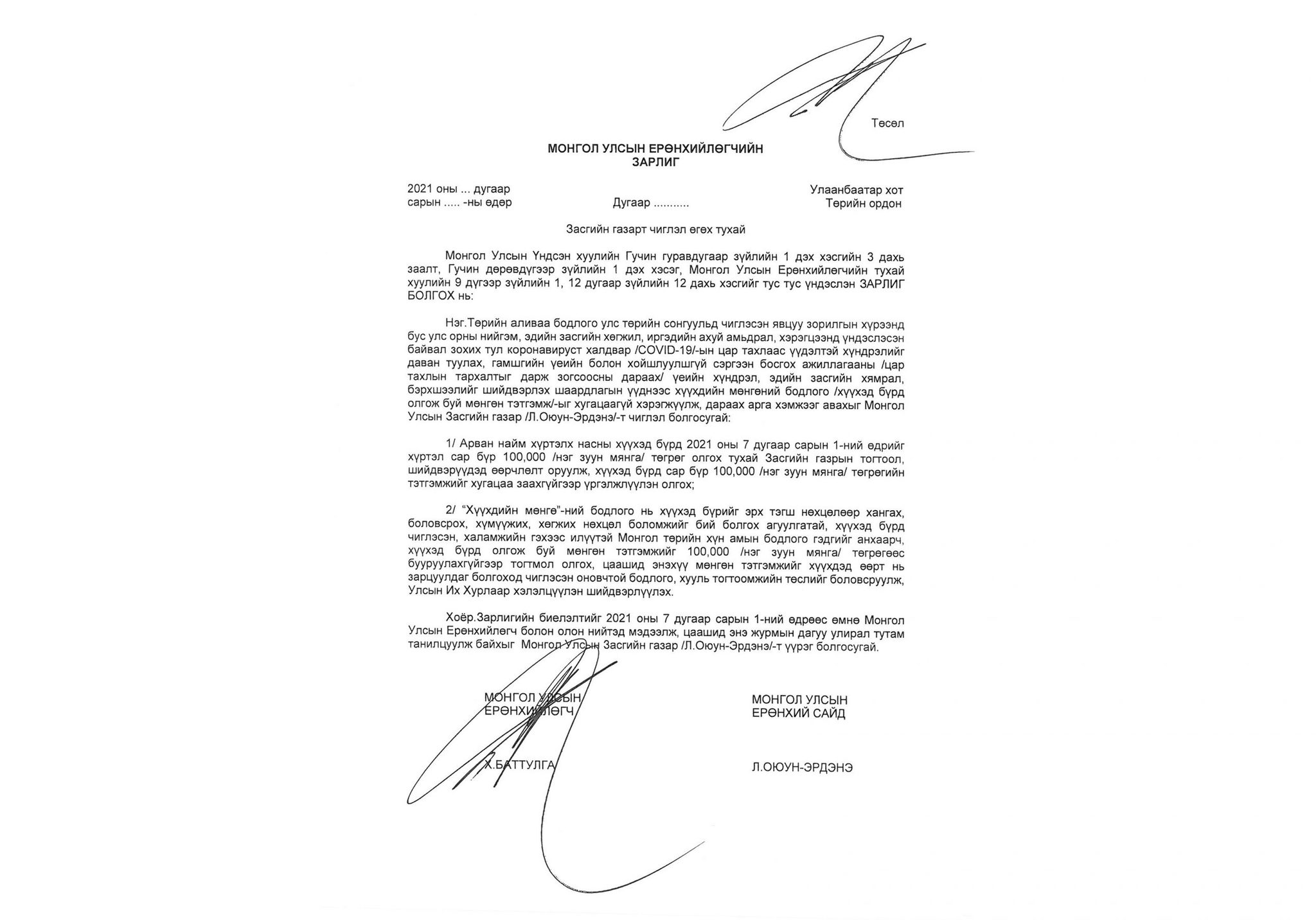Хоёр.Зарлигийн биелэлтийг 2021 оны 7 дугаар сарын 1-ний өдрөөс өмнө Монгол Улсын Ерөнхийлөгч болон олон нийтэд мэдээлж, цаашид энэ журмын дагуу улирал тутам танилцуулж байхыг  Монгол Улсын Засгийн газар /Л.Оюун-Эрдэнэ/-т үүрэг болгосугай.”