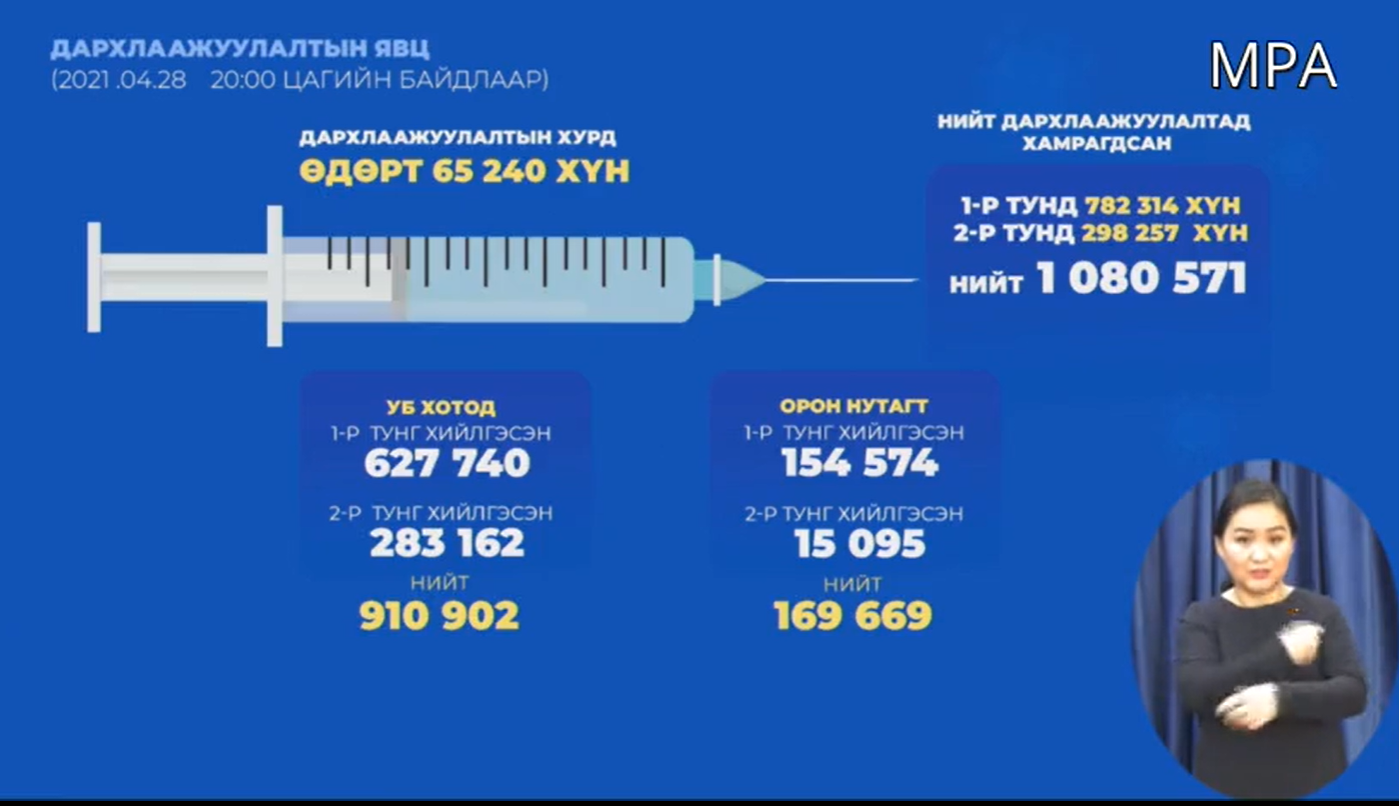 -Сүүлийн 24 цагийн хугацаанд 65 240 хүн дархлаажуулалтад хамрагджээ. Ингэснээр улсын хэмжээнд нийт нэгдүгээр тунд 782 314, хоёрдугаар тунд 298 257 хүн хамрагдсан байна. Нийслэлийн хэмжээнд нийт 910 902, орон нутаг 169 669 хүн вакцинжуулжээ.
