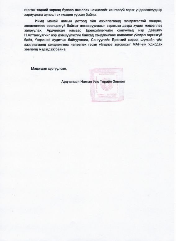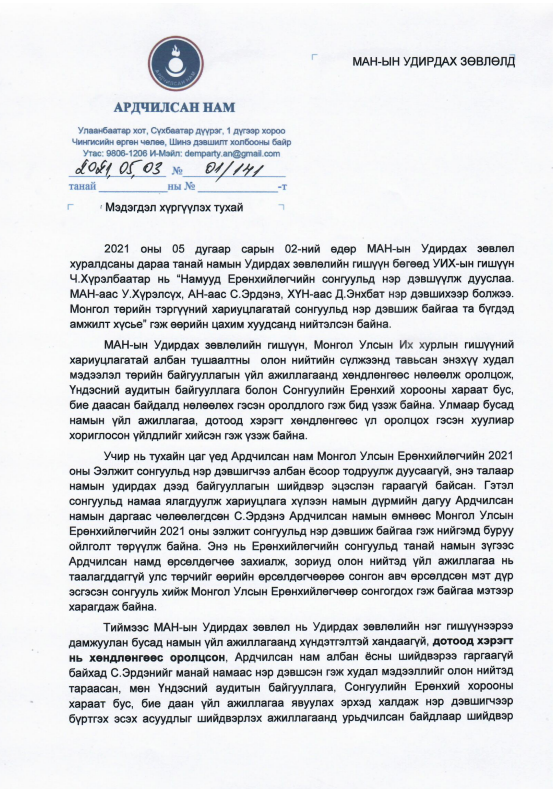 АН-ын Улс төрийн зөвлөлөөс МАН-д мэдэгдэл хүргүүллээ