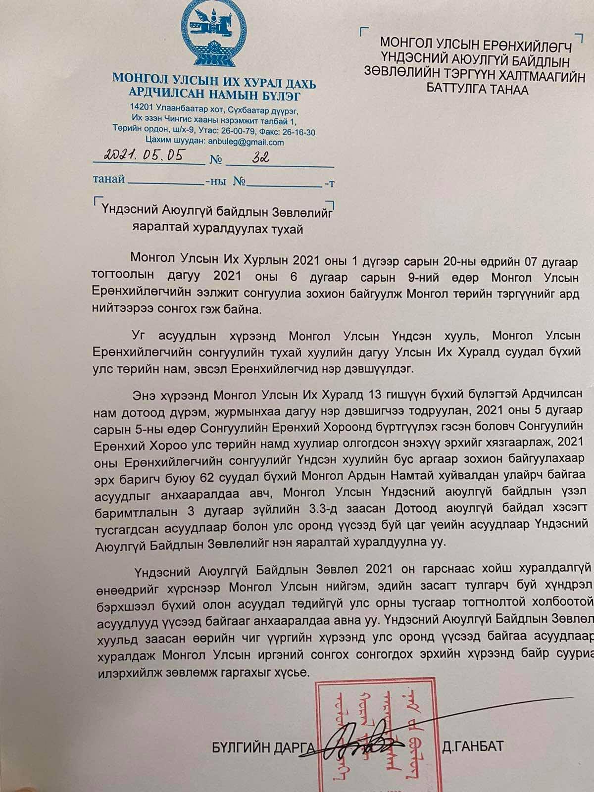 Өнөөдөр УИХ-ын Ардчилсан намын бүлгийн дарга Д.Ганбат Монгол Улсын Ерөнхийлөгчид ҮАБЗ-ийг яаралтай хуралдуулах тухай хандлаа. Учир нь УИХ-д 13 суудалтай Ардчилсан нам дотоод журмынхаа дагуу нэр дэвшигчээ тодруулан, 2021 оны 05 дугаар сарын 05-ны өдөр СЕХ-нд бүртгүүлэх гэсэн боловч СЕХ улс төрийн намд хуулиар олгогдсон энэхүү эрхийг хязгаарлалаа. Монгол Ардын Намтай хуйвалдан улайрч байгаа асуудлыг анхааралдаа авч, улс оронд үүсээд байгаа цаг үеийн асуудлаар ҮАБЗ-ийн хурлыг нэн яаралтай хуралдуулна уу хэмээн Монгол Улсын Ерөнхийлөгчид албан тоот илгээсэн байна. ҮАБЗ хуралдаж иргэний сонгох сонгогдох эрхийн хүрээнд байр сууриа илэрхийлж зөвлөмж гаргахыг хүссэн байна.