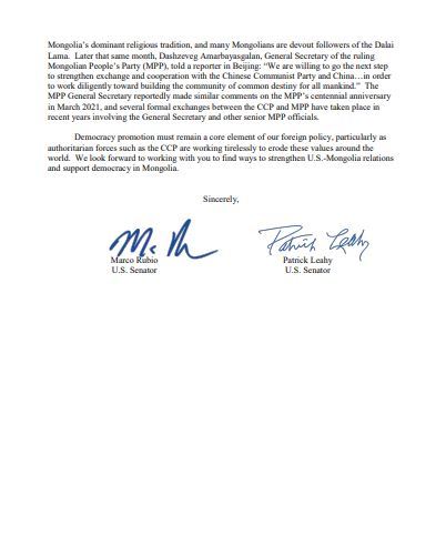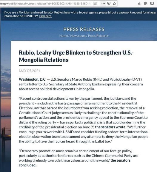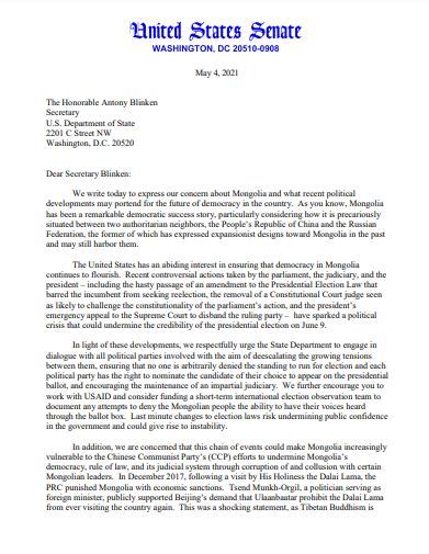 АНУ-ын хоёр сенатч Төрийн нарийн бичгийн даргадаа Монголын асуудал тэр тусмаа эрх баригч хүчний хийж буй үйлдэлд анхаарал хандуулахыг хүсч захидал илгээжээ. Уг захидалд "Бид энэхүү захидлыг Монгол Улсад сүүлийн үед өрнөж буй улс төрийн үйл явдлууд тус улсын ардчиллын ирээдүйд хэрхэн нөлөөлж болох талаар санаа зовнин бичиж байна. Та мэдэж байгаачлан Монгол Улс бол ардчилсан нийгмийг амжилттайгаар байгуулж чадсан онцгой нэгэн орон билээ. Ялангуяа БНХАУ, ОХУ гэсэн авторитар дэглэмтэй хоёр орны дунд оршдог орны хувьд, тэр тусмаа БНХАУ-ын зүгээс Монгол Улсын талаар өмнө нь өөрийн газар нутагт хамааруулж ойлгодгоо илэрхийлж байсан, одоо ч тэр бодлогоо баримталж байж магадгүй байгаа нөхцөлд Монгол Улс ардчиллаа өдий зэрэгтэй авч явна гэдэг чухал амжилт юм.