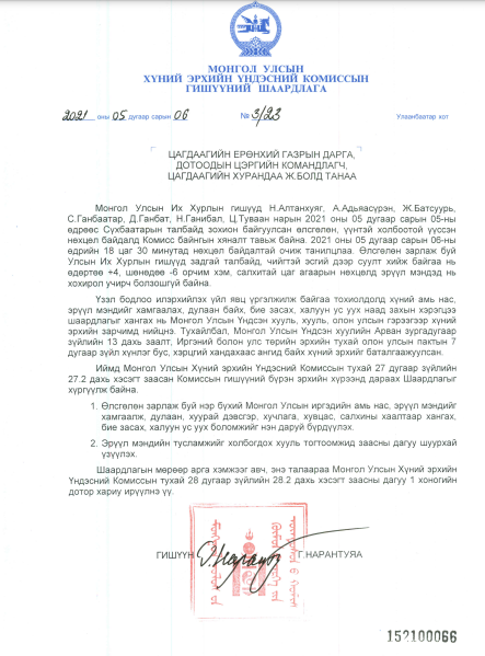 Монгол Улсын Их Хурлын гишүүд 2021 оны 5 дугаар сарын 5-ны өдрөөс Сүхбаатарын талбайд өлсгөлөн зарлаж эхэлсэн. ХЭҮК үйл явцад хяналт тавин ажиллаж байгаа бөгөөд Цагдаагийн ерөнхий газрын даргад шаардлага хүргүүллээ.