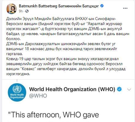 "Дэлхийн Эрүүл Мэндийн Байгууллага БНХАУ-ын Синофарм-Веросэлл вакцин (бидний хэрэглэж буй)-ыг “Яаралтай журмаар хэрэглэх жагсаалт”-д бүртгэснээр тус вакцин ДЭМБ-ын аюулгүй байдал, үр нөлөө, чанарын баталгаажуулалтыг авсан 6 дахь вакцин боллоо.
