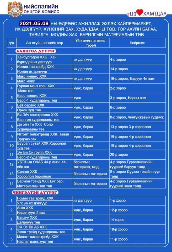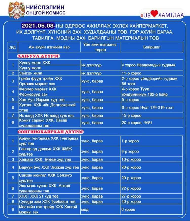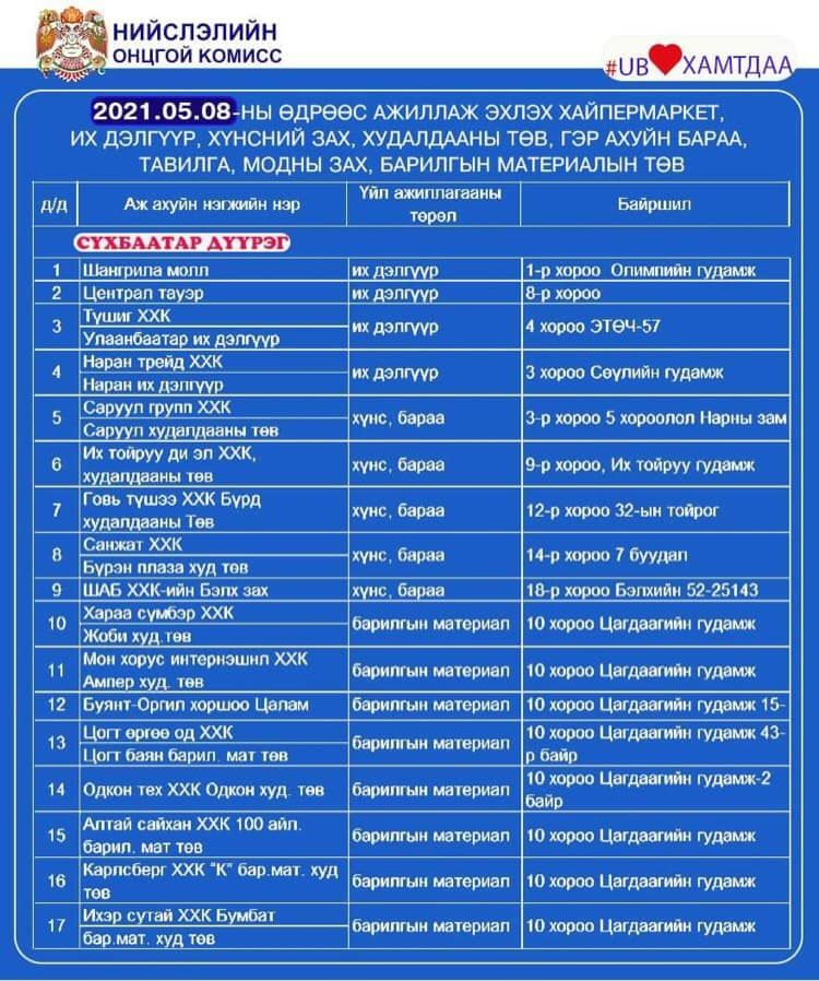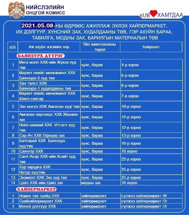 Халдвар хамгааллын дэглэмийг нэг түвшин бууруулсантай холбогдуулан зах, худалдааны төвүүдийг үе шаттайгаар нээж байна. Үйл ажиллагаа явуулж байгаа худалдаа, үйлчилгээний байгууллагуудыг танилцуулж байна.