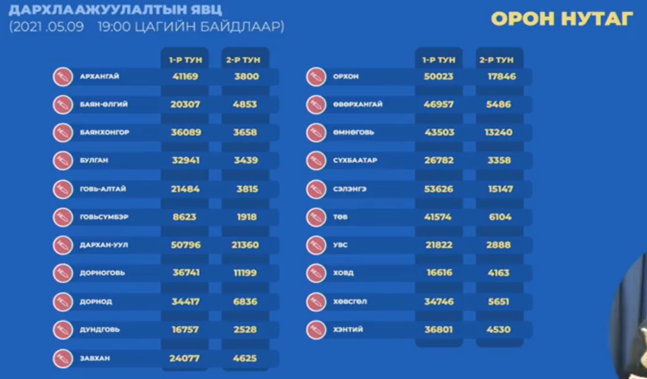 -Сүүлийн 24 цагийн хугацаанд 38 599 хүн дархлаажуулалтад хамрагджээ. Ингэснээр улсын хэмжээнд нийт нэгдүгээр тунд 1 590 636, хоёрдугаар тунд 622 740 хүн хамрагдсан байна.